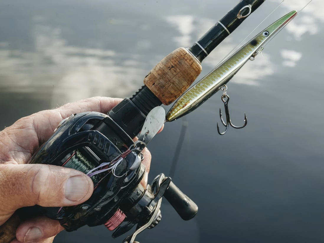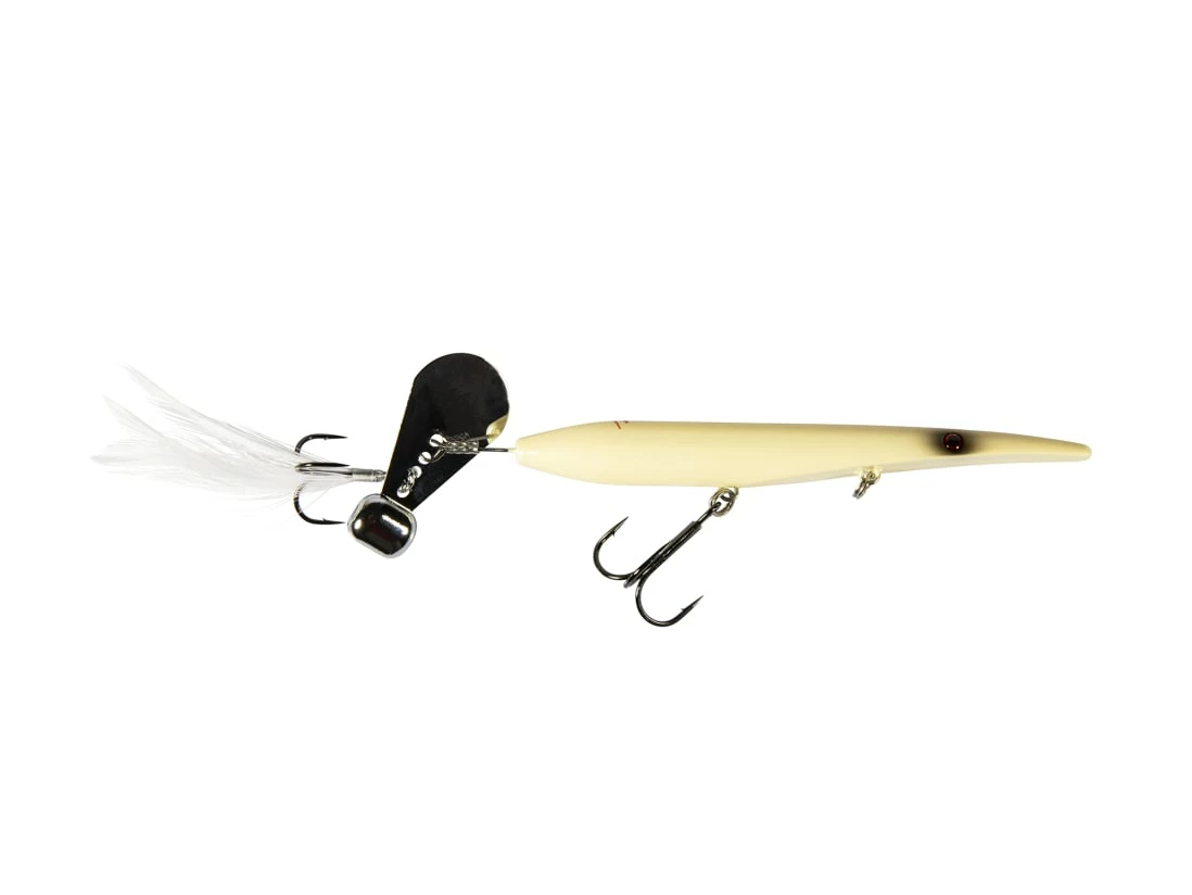 A thin, elongated, minimalist body sports a belly line tie and a single treble hook. The weighted tail blade connects to a rear, feathered treble hook to accentuate swimming motion and focus strike attention. Ten body-blade-feather patterns cater to any situation or water color.